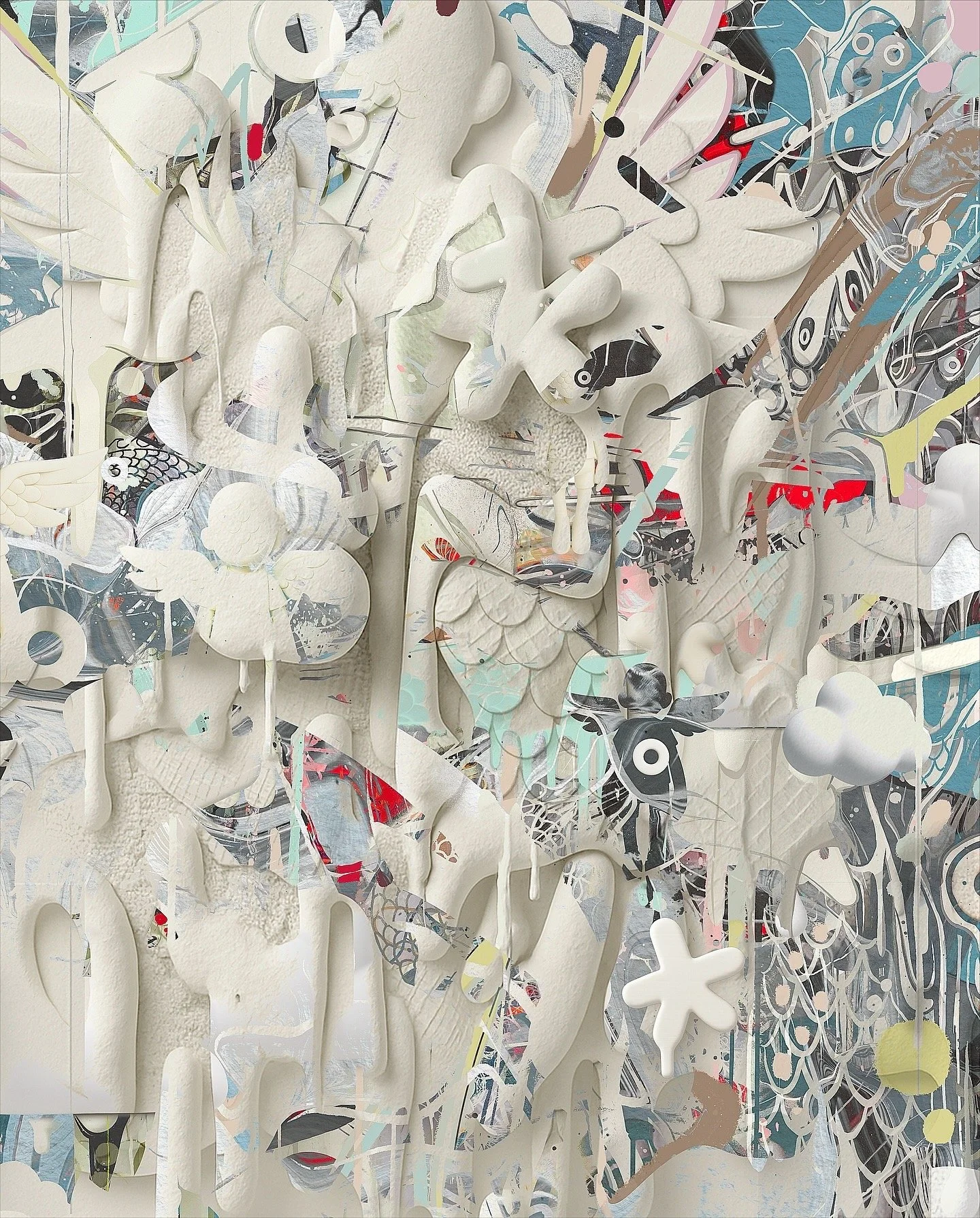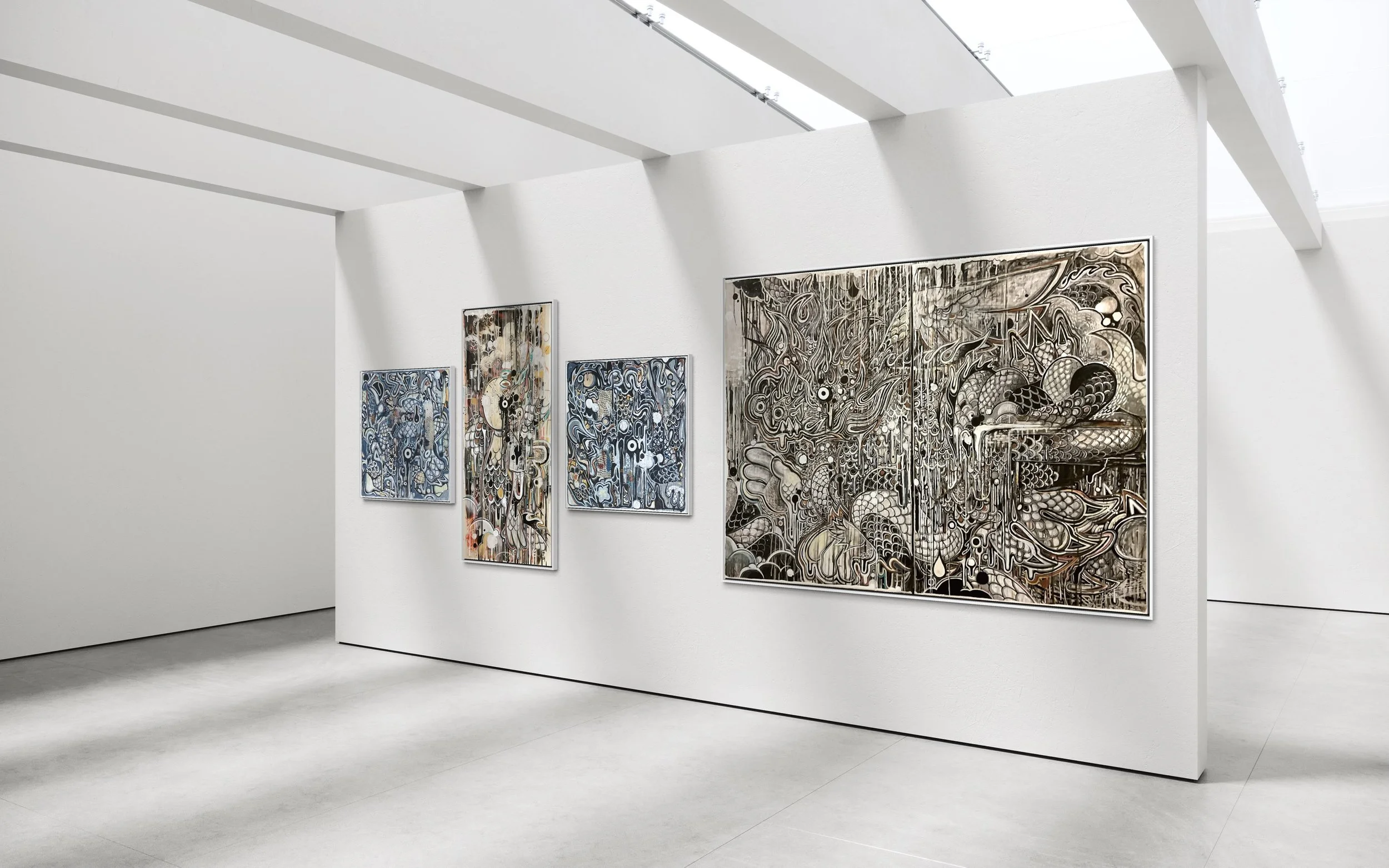 In these layered environments, fragments of language, gesture, and symbol collide, reflecting the tension between our physical and digital existences. The result is a meditation on perception in a crowded, chaotic world—where we continuously search for coherence, intimacy, and truth within the noise of contemporary life.