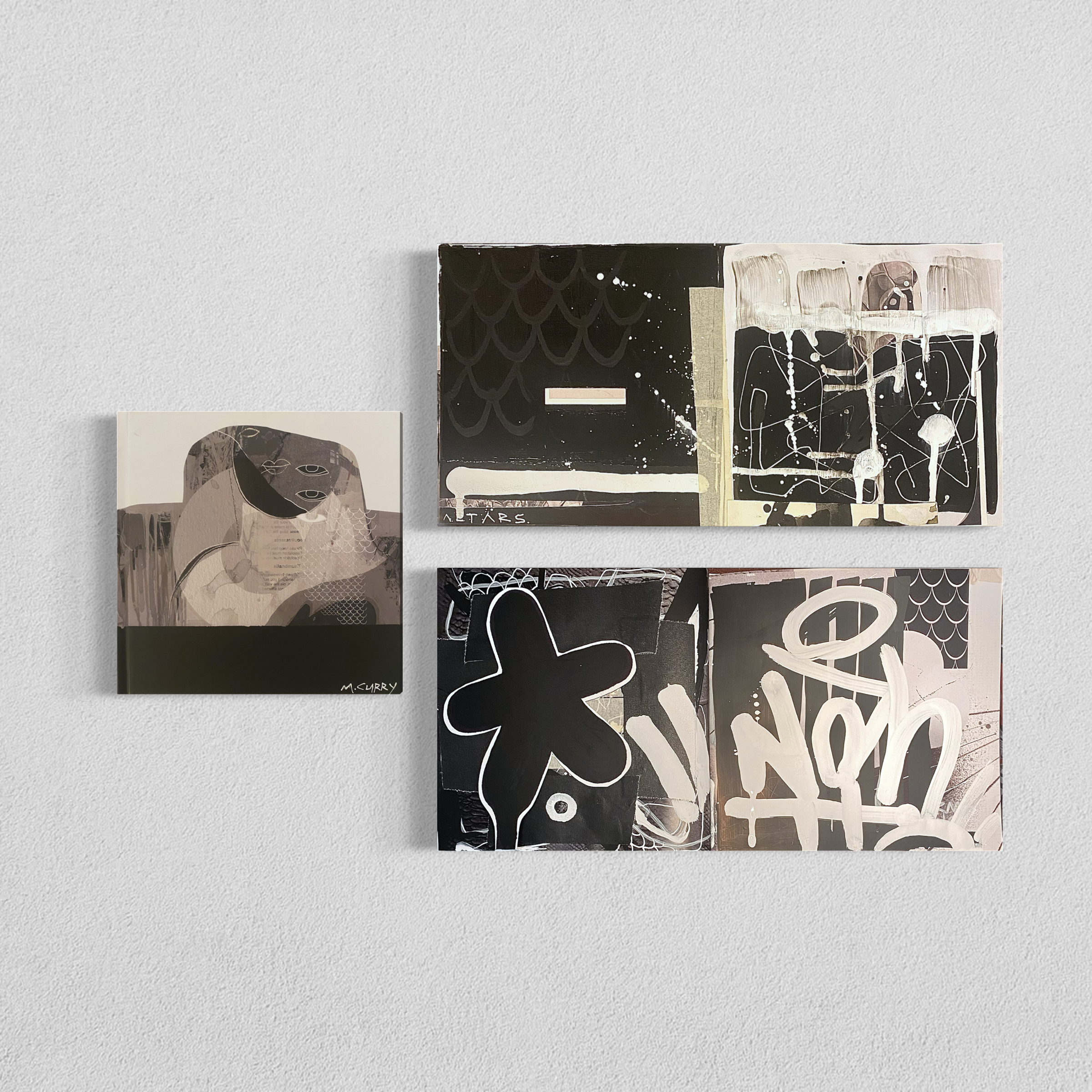 ALTARS JOURNAL, 2026. 8” x 8” 38 page book. Acrylic, charcoal, collage, enamel, ink, steel, and tape. Edition of one.