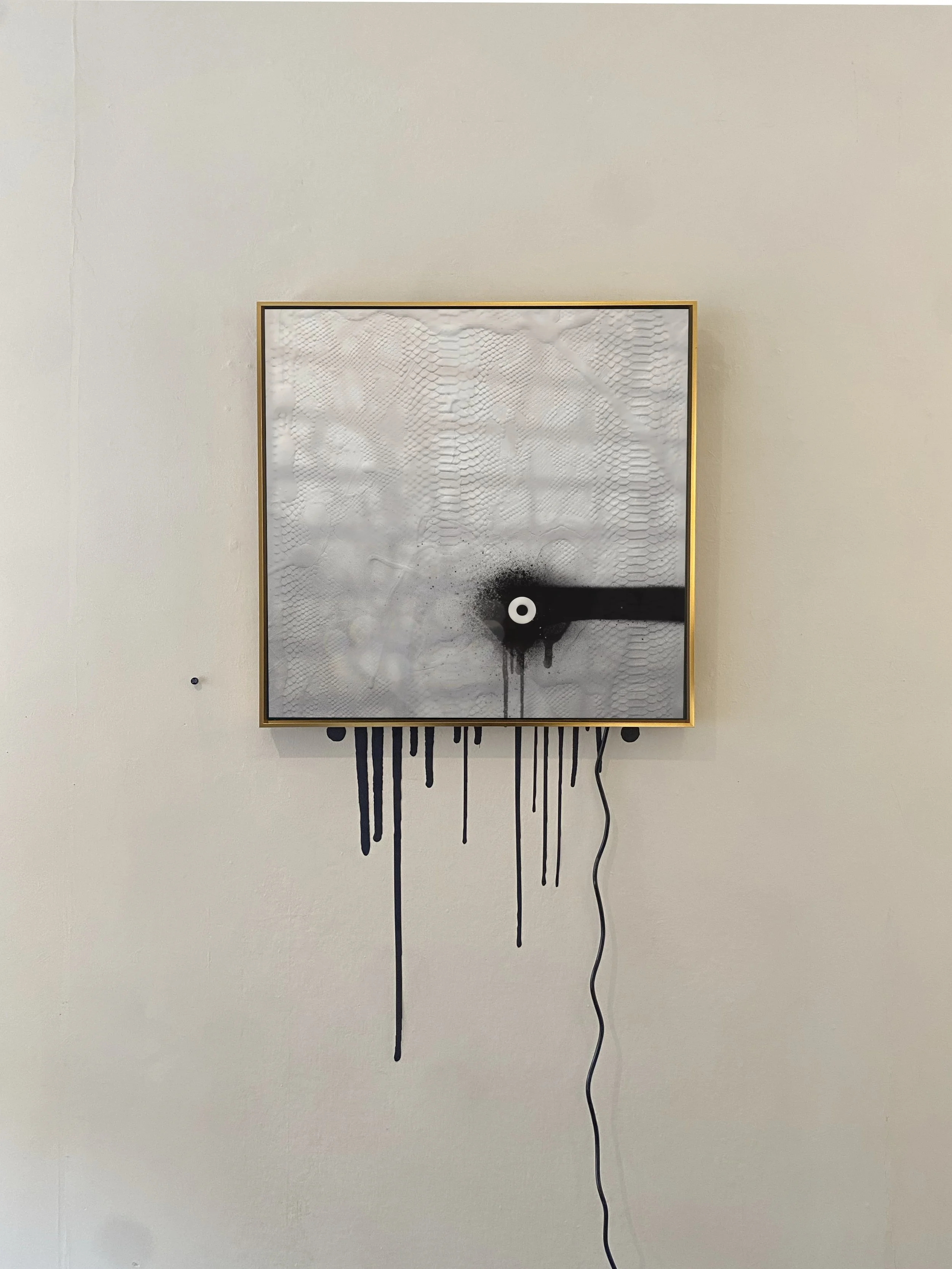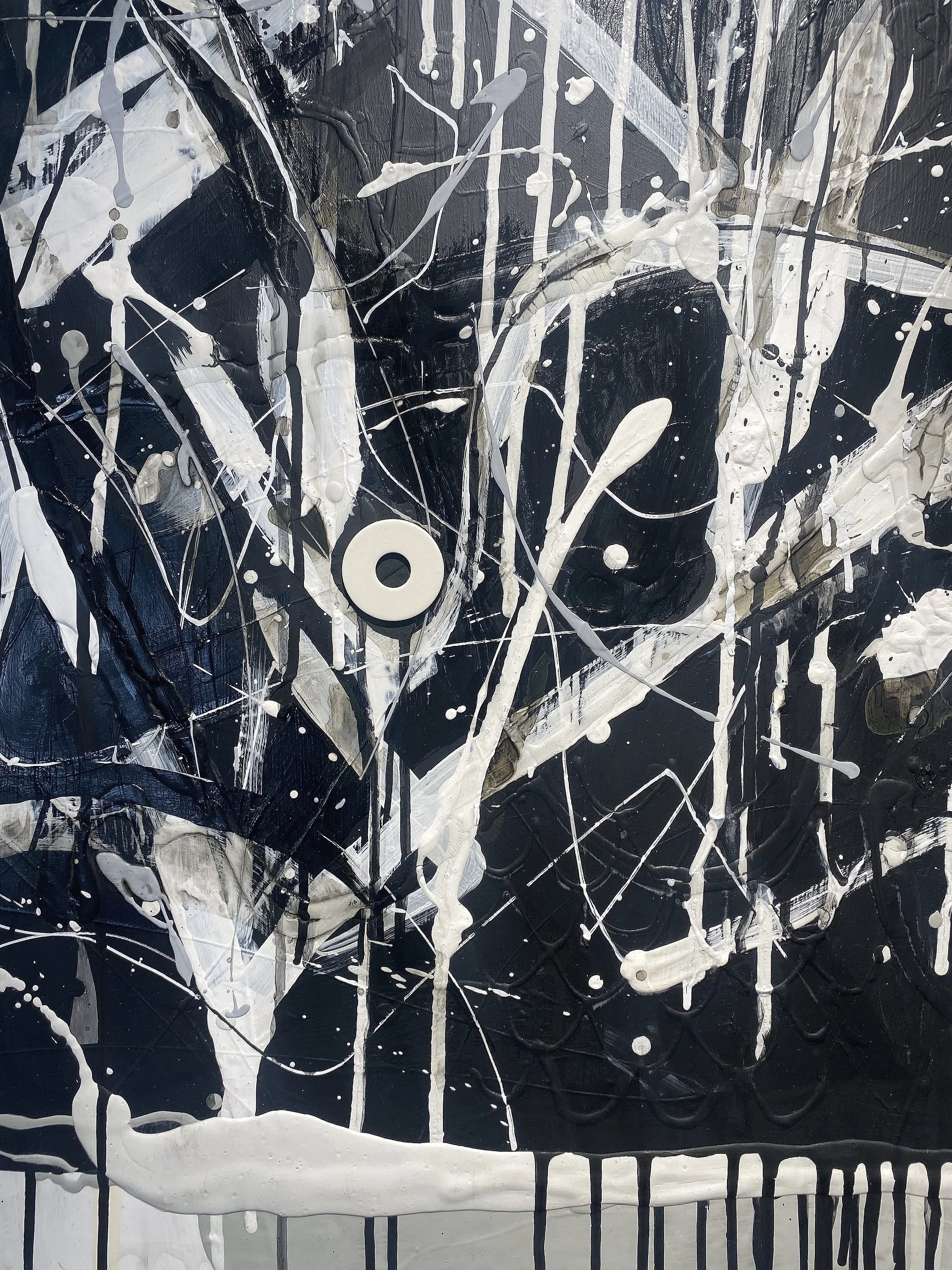 Altars is a series of works that combine gestural abstraction with restrained, graphic structures. The compositions reference the visual language of personal smart devices, including screens, interfaces, and data fields, rendered in a deliberately vague and imperfect manner, as if drawn by a primitive hand. Limited palettes and rigid frameworks contain expressive marks, with drips falling like barcodes and painted steel washers suggesting an ever-present eye that points to a system of consumption, surveillance, and control.