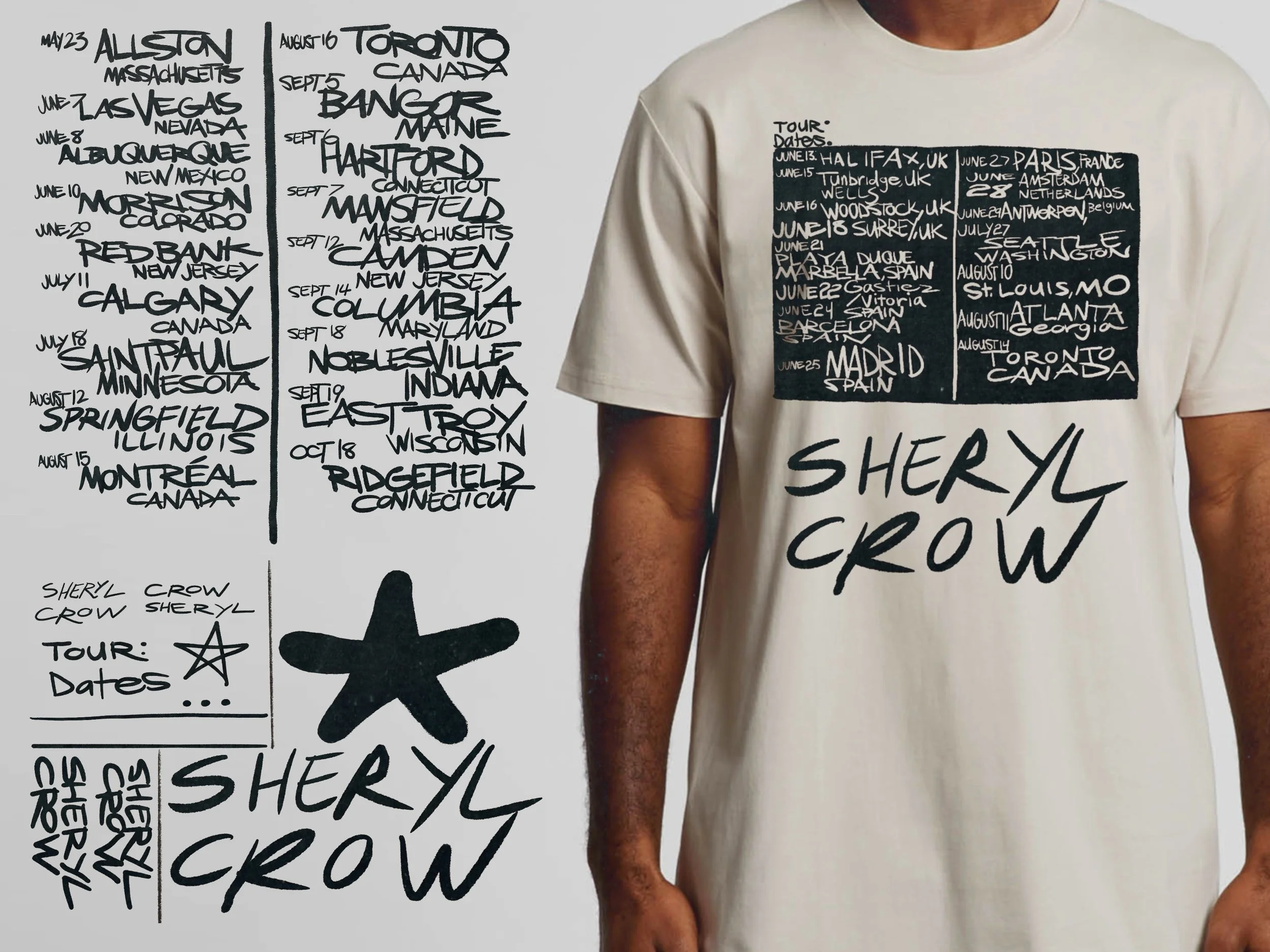 I created the handcrafted typography for Sheryl Crow’s world tour, spanning posters, apparel, and merchandise. The tour tee shirt became the best-selling merch item in her touring history, and the designs were recently updated for her 2025 tour. Bold, raw, and human—lettering that amplified the energy of her live performances.