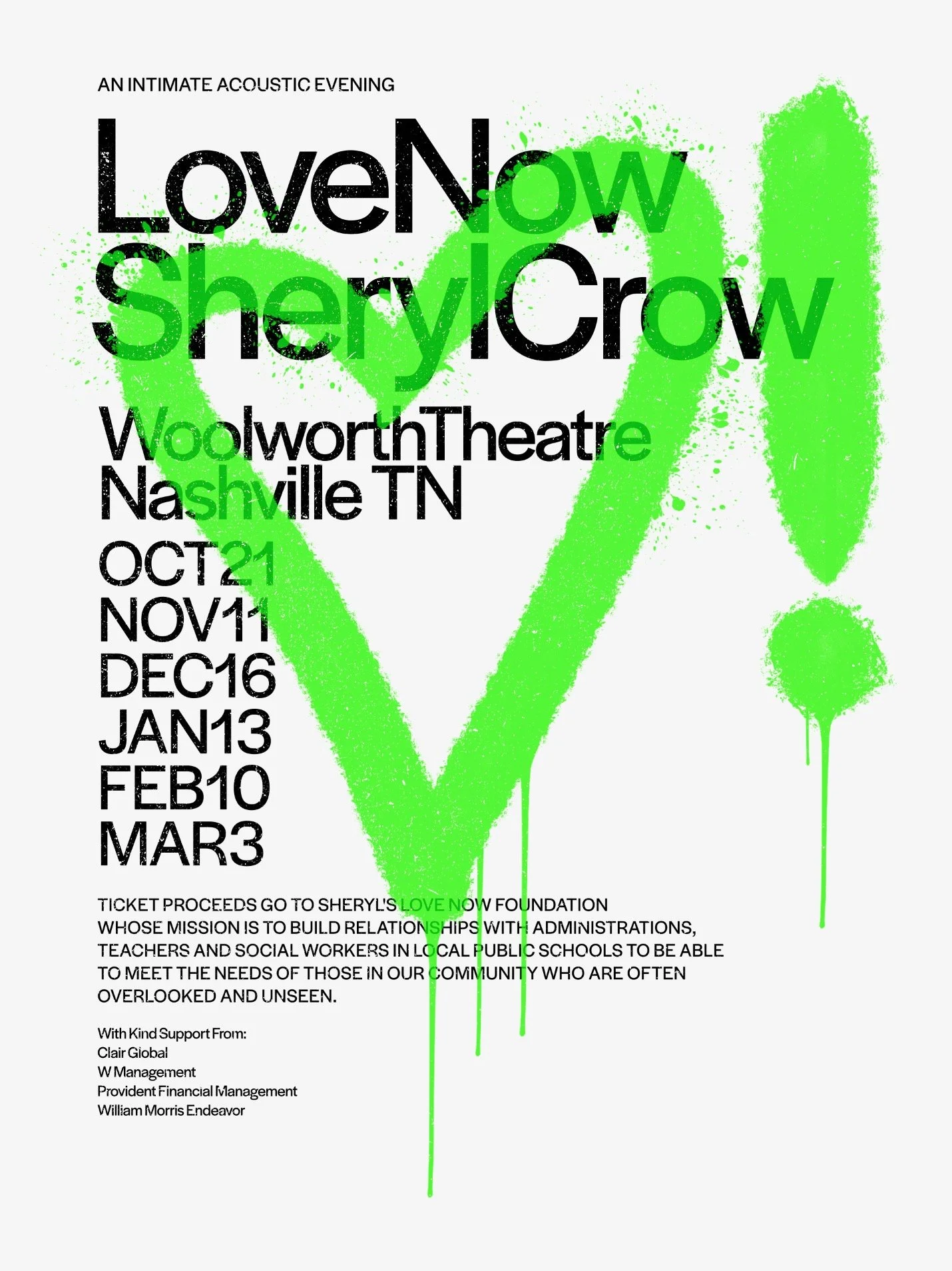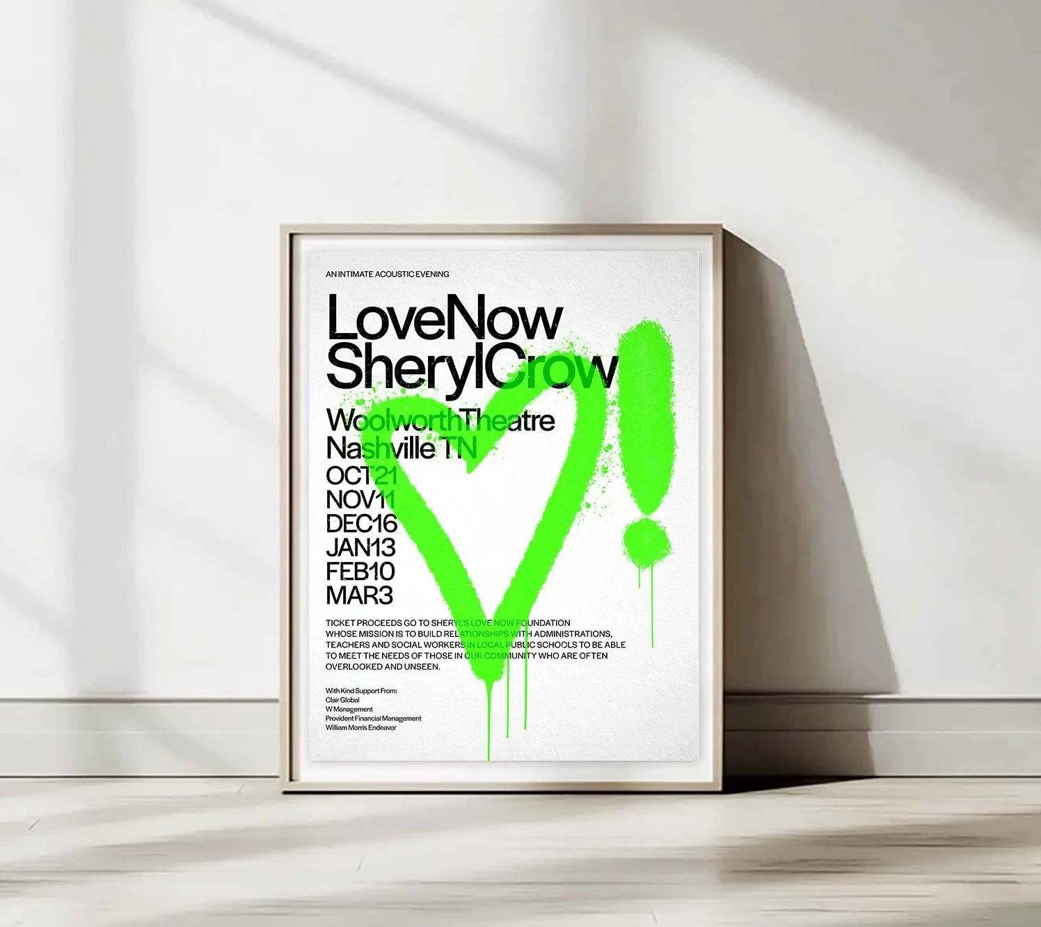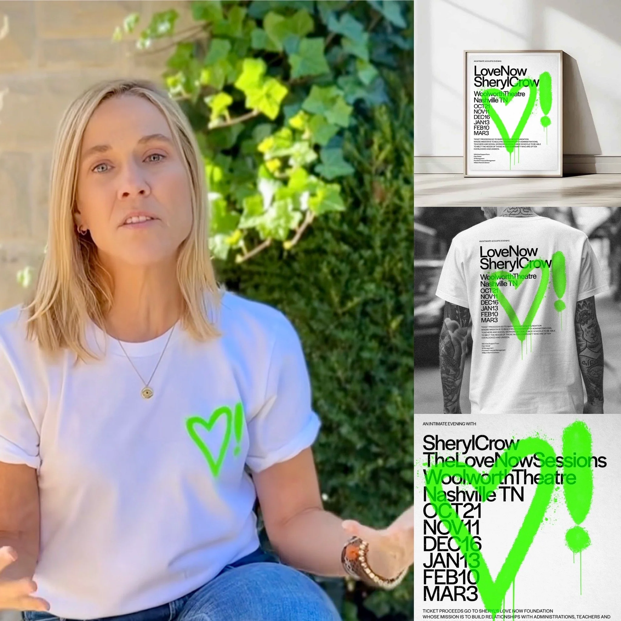 In addition to designing the branding for Sheryl Crow’s world tour collateral for 2024 & 2025 Neal Ashby & Matthew Curry were asked to design the collateral for the upcoming philanthropic concert series: Love Now